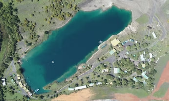The large clear diving lake is an old open cast chrome mine surrounded by natural bush and farmlands.