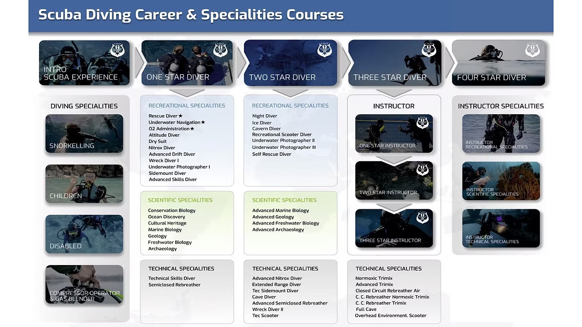 Upon completion of your Open Water - One Star Diver Training you will have sufficient knowledge, skills and experience to procure air, equipment, and other diving services and to plan, conduct, and log open-water dives that do not require mandatory in-water decompression stops, without the supervision of a Scuba Instructor or Divemaster, when properly equipped and accompanied by another certified diver of at least the same level, provided the diving activities undertaken, the diving conditions and the diving area are similar, equal or better to those in which training was received.