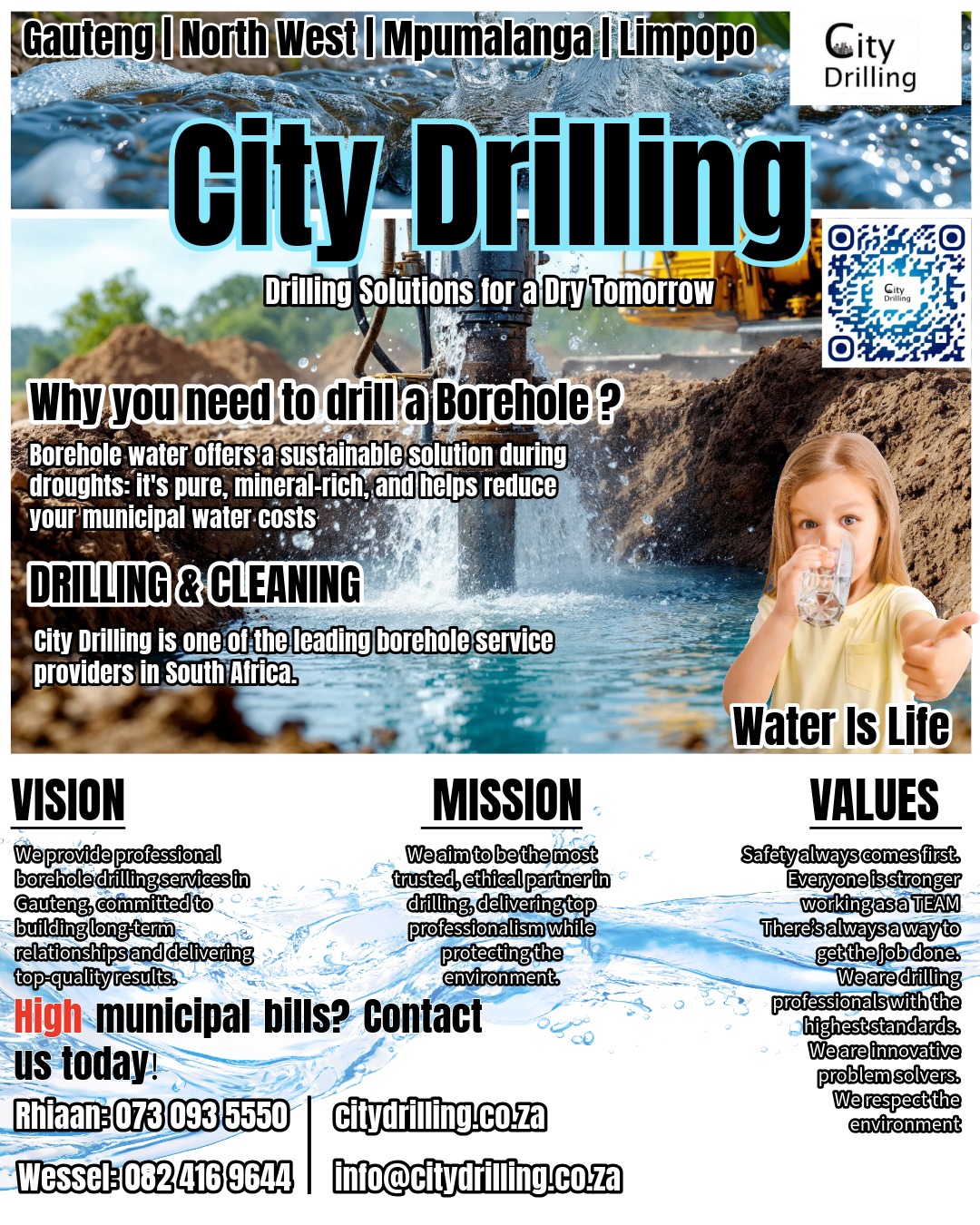 To render professional services in borehole drilling and committed to long term relationship with our clients and strive to be the best drilling company in Gauteng.