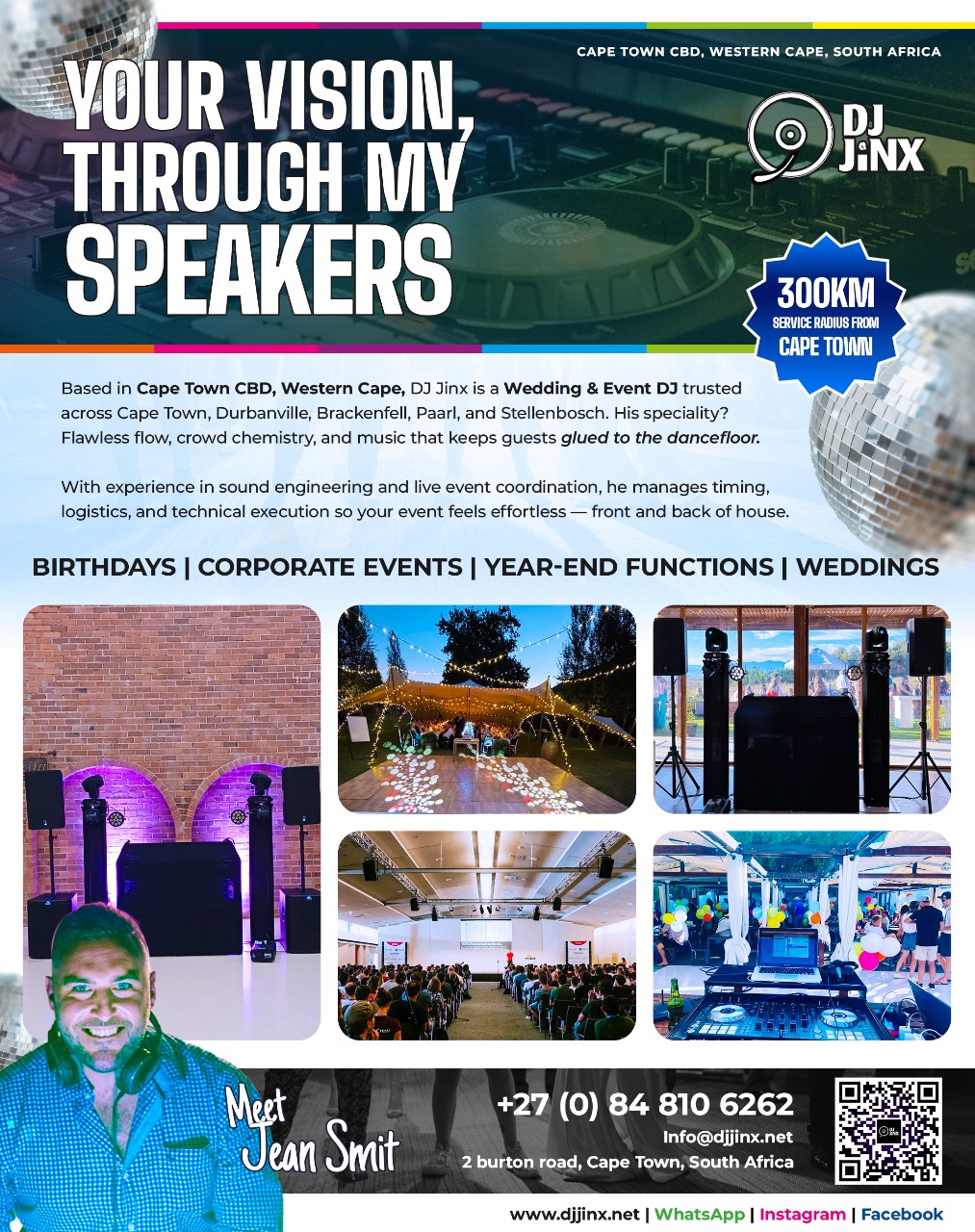 Whether you’re planning a wedding in Durbanville, a corporate event in Cape Town, or a celebration in Paarl or Stellenbosch, DJ Jinx brings the energy, timing, and calm coordination that make every moment flow exactly as it should.