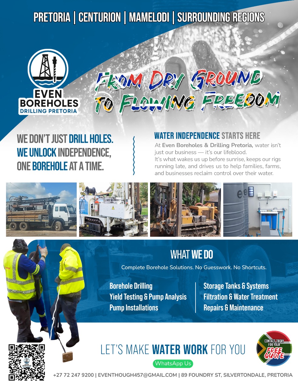 At Even Boreholes Drilling Pretoria, water is not just our business — it’s our passion, our purpose, and what drives us every single day.