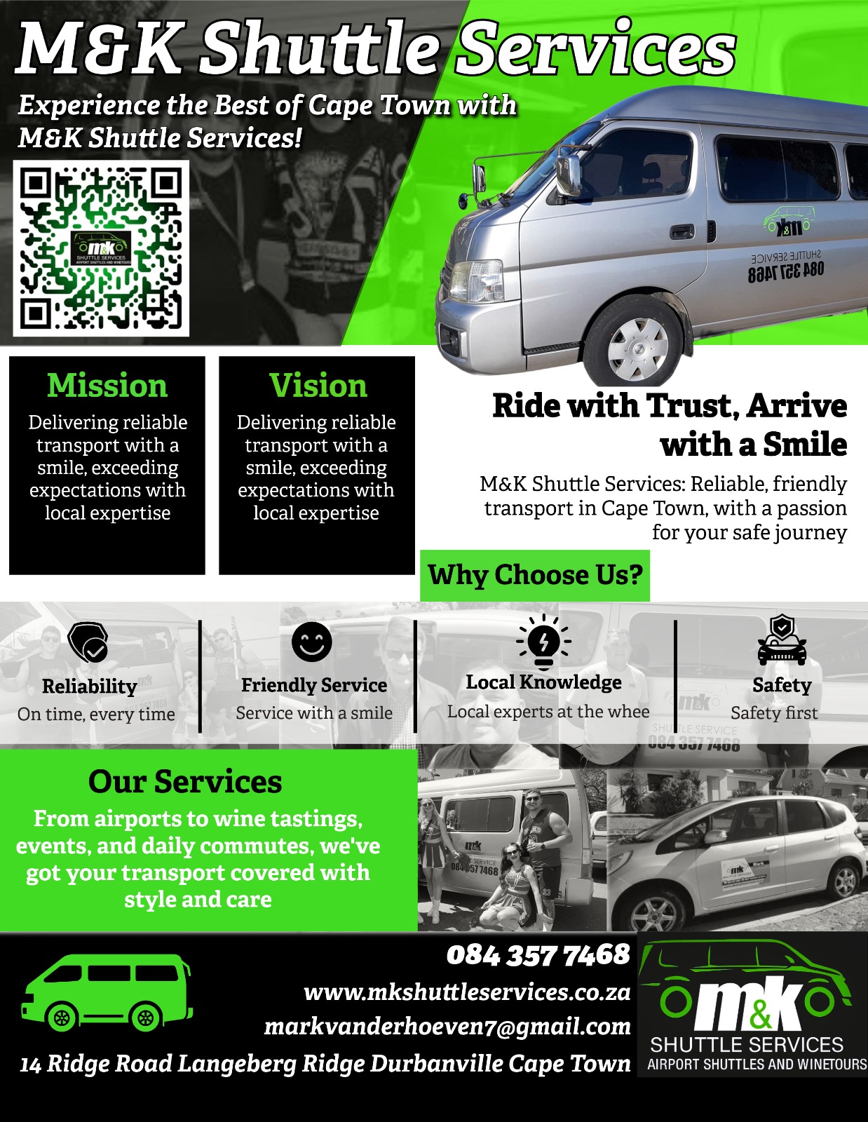 At M&K Shuttle Services, we're dedicated to providing reliable, friendly, and efficient transport solutions in and around Cape Town. Based in Durbanville, our team is passionate about delivering exceptional service and ensuring a smooth and safe journey for all our clients.