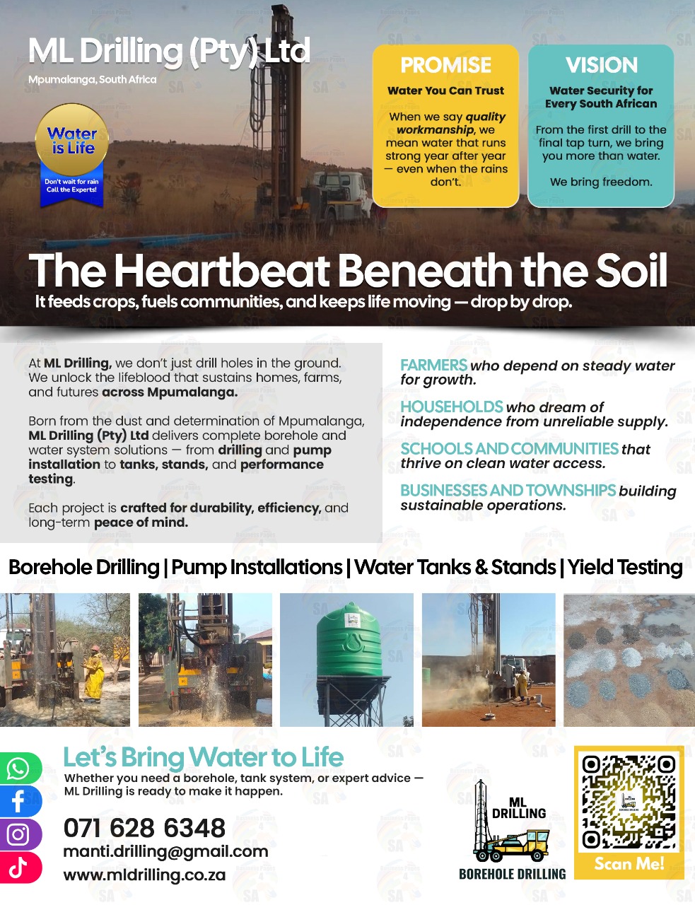 Need a borehole, water tank, pump installation, or water supply consultation? Contact ML Drilling (Pty) Ltd – we’re here to provide reliable water solutions fitting your specific needs in Mpumalanga.