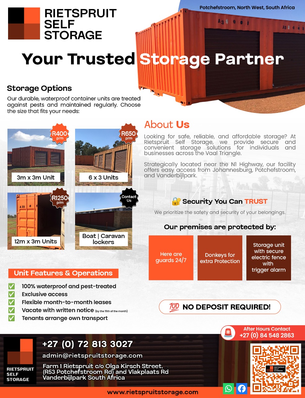 At Rietspruit Self Storage, we offer a secure and convenient storage solution for individuals and businesses in the Vaal Triangle area.