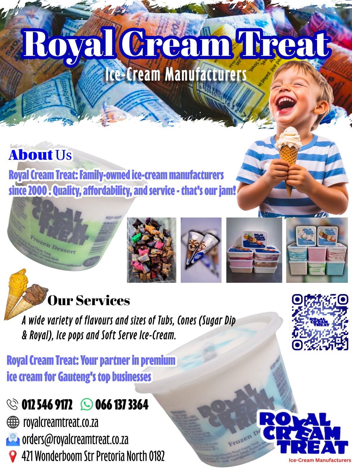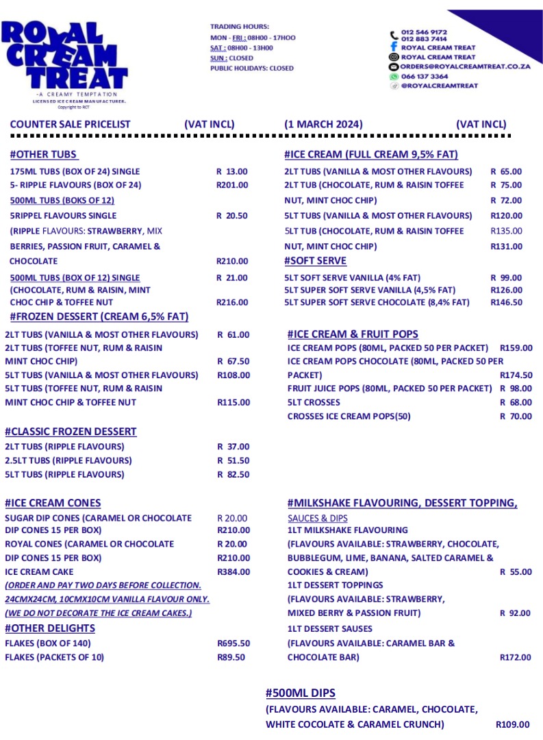 - A wide variety of flavours and sizes of Tubs, Cones (Sugar Dip & Royal), Ice pops and Soft Serve Ice-Cream.-