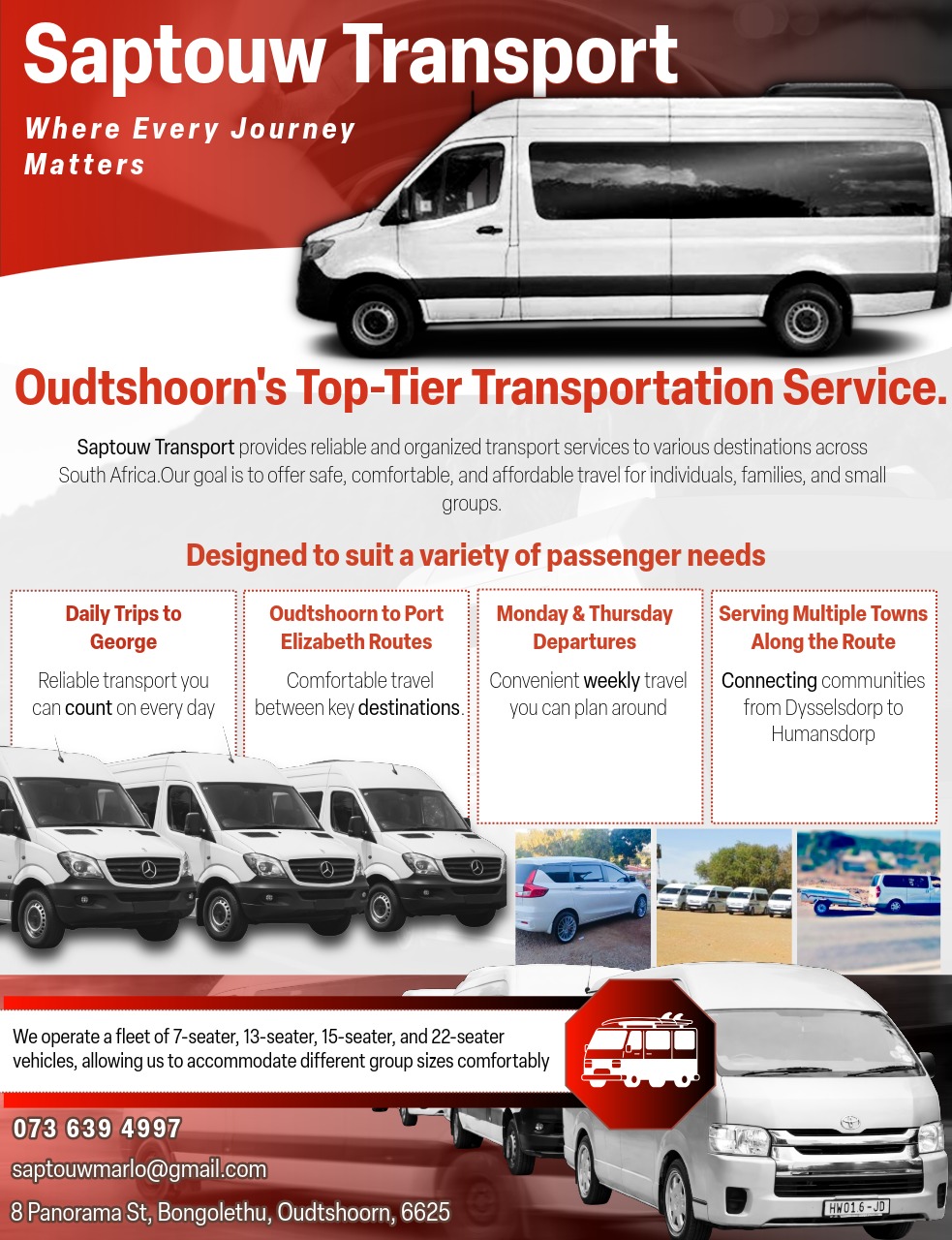Our services include daily transport to George, as well as scheduled trips between Oudtshoorn and Port Elizabeth