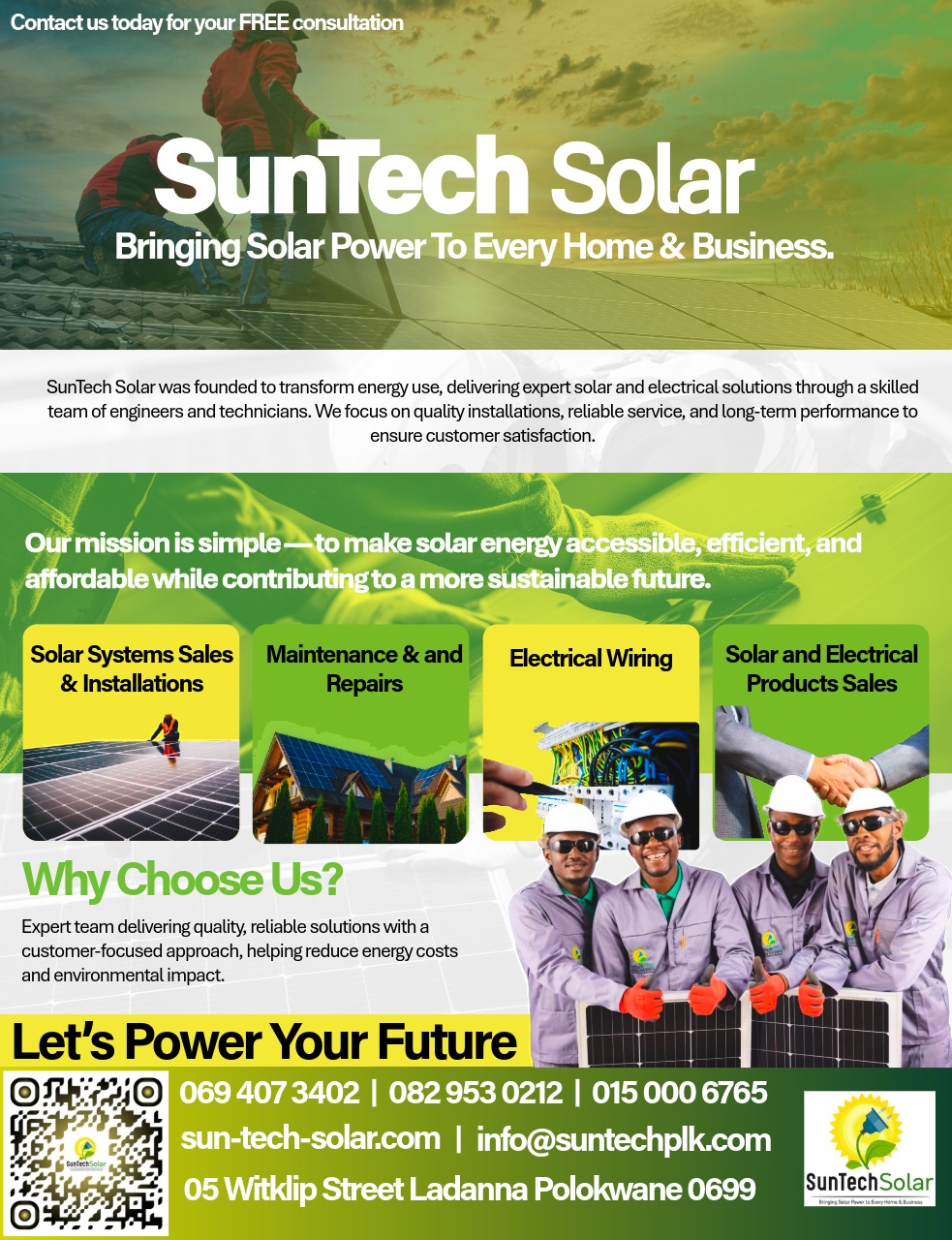 Welcome to SunTech Solar Energy, where innovation meets sustainability. Based in Polokwane, we are a trusted provider of renewable energy solutions, helping homes and businesses transition to clean, reliable, and cost-effective solar power.