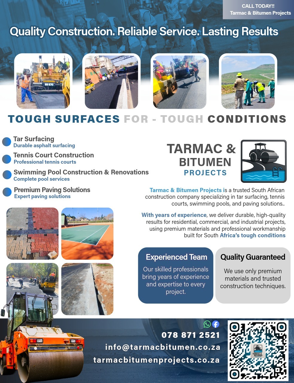 Tarmac & Bitumen Projects is a trusted South African construction company specializing in tar surfacing, tennis court construction, swimming pools, and paving solutions.