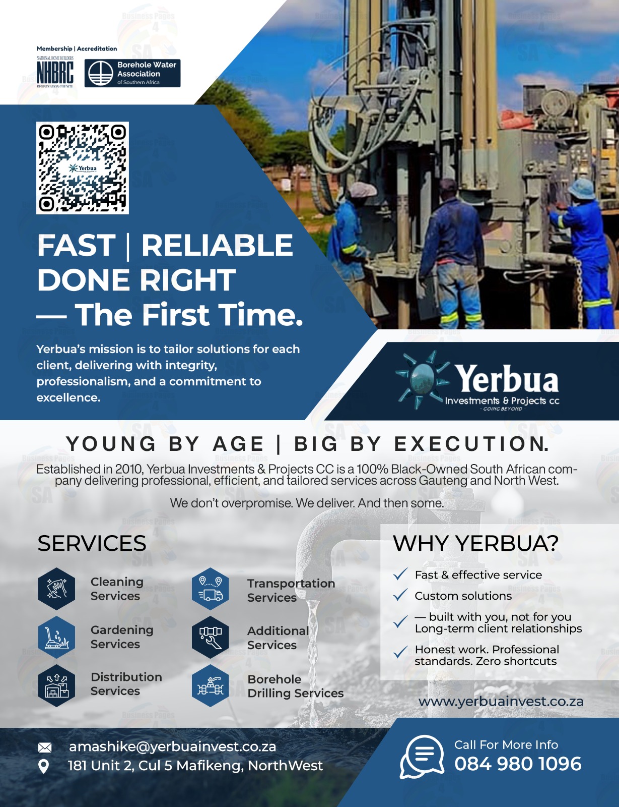 After a long and hard research the owner of YERBUA Mr. Aubrey Mashike realized a need to establish a company that will provide fast and effective quality services to its clients.